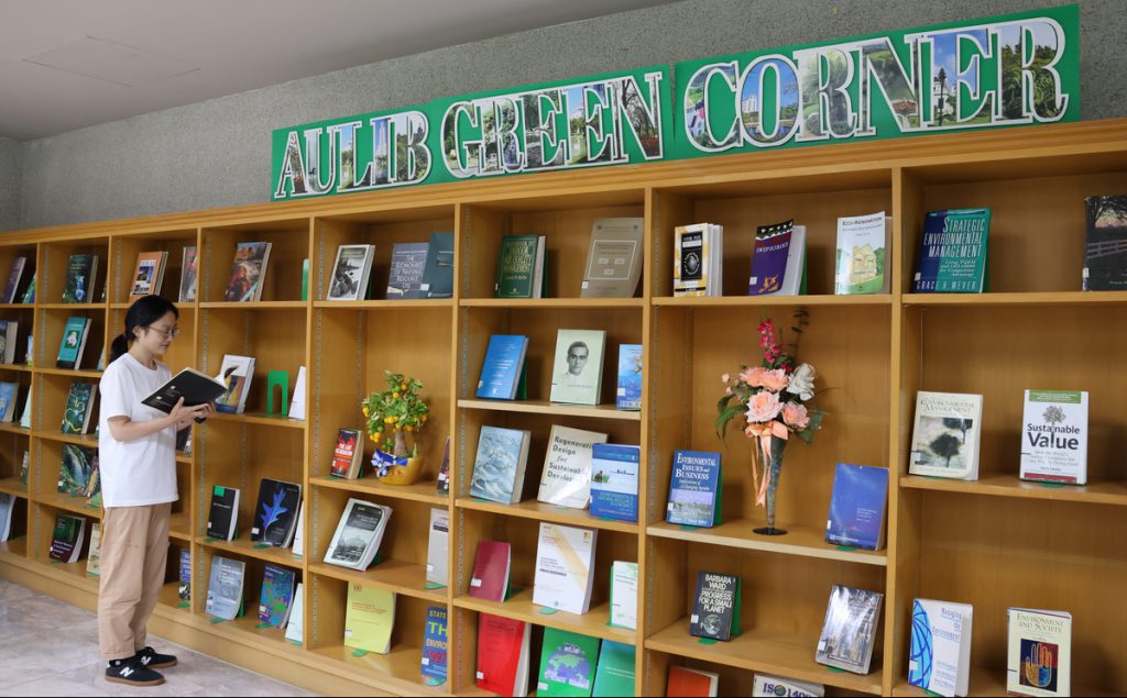 สำนักหอสมุด ได้จัดสรรพื้นที่ของห้องสมุดที่วิทยาเขตสุวรรณภูมิ บริเวณชั้น 3 ให้เป็น Green Corner หรือพื้นที่ส่งเสริมการเรียนรู้ของห้องสมุดสีเขียวให้บริการทรัพยากรสารสนเทศด้านการอนุรักษ์พลังงานและสิ่งแวดล้อมเพื่อมุ่งหวังให้ผู้ใช้บริการเกิดความตระหนักถึงความสำคัญของการอนุรักษ์พลังงานและสิ่งแวดล้อมและเพื่อเป็นการส่งเสริมให้ผู้ใช้บริการนำความรู้ไปใช้ให้เกิดประโยชน์ต่อการเรียนการสอน ตลอดจนปรับใช้ในชีวิตประจำวันได้ซึ่งทรัพยากรสารสนเทศที่ให้บริการในGreen Corner ประกอบด้วยหนังสือและสื่อต่างๆ ที่เกี่ยวกับการอนุรักษ์พลังงานและสิ่งแวดล้อม